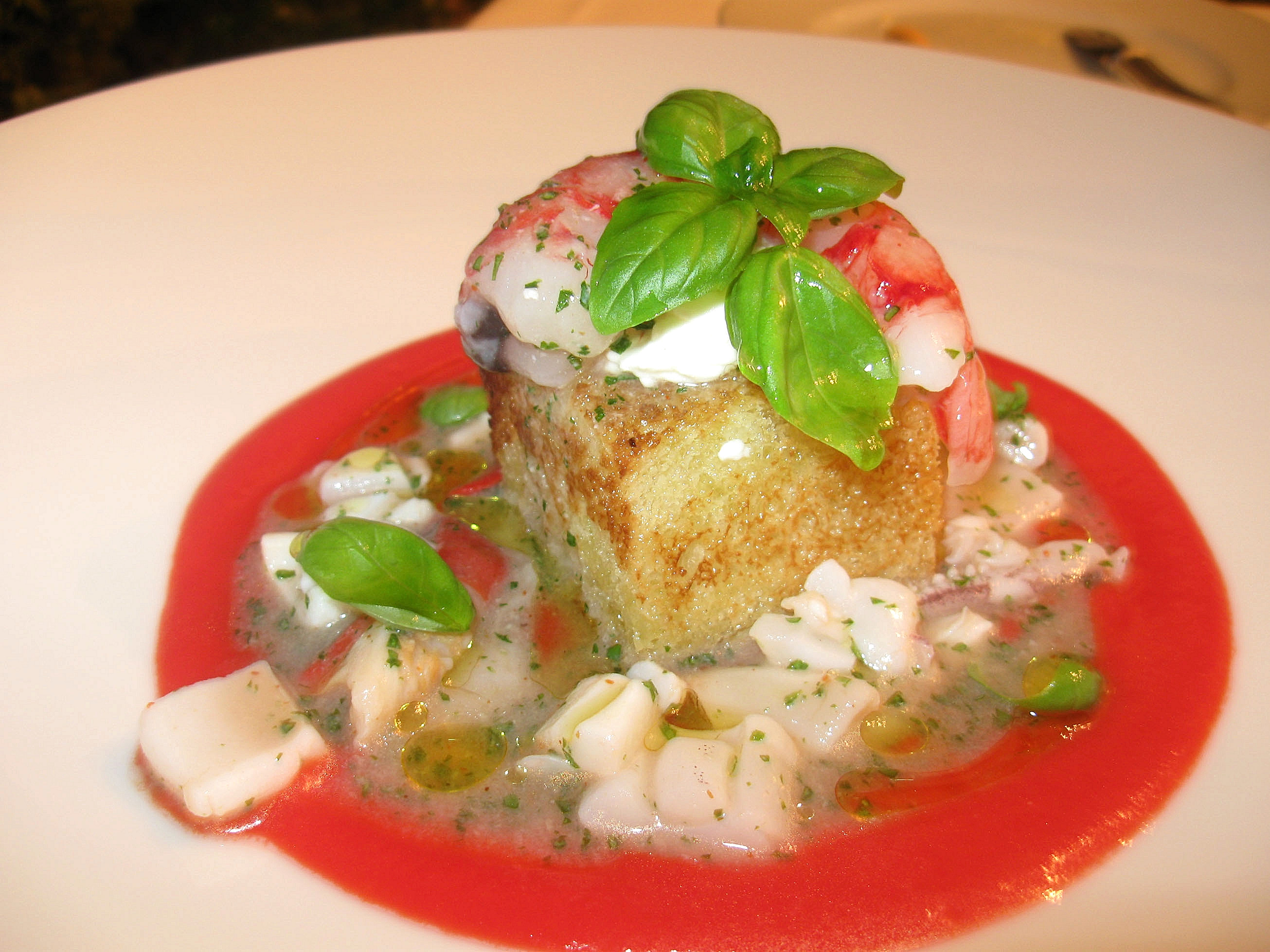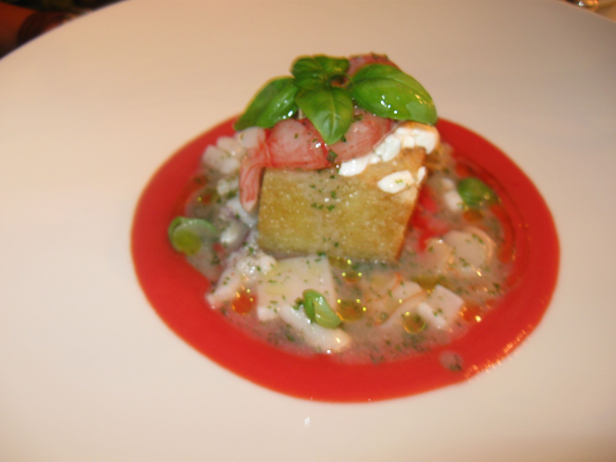 Il piatto della serata. Eleganza, consistenza, concretezza. Tutte insieme. La crema di pomodoro estrae l’essenza dell’ortaggio e, di conseguenza, del territorio. Alcuni crostacei sono appena cotti, qualcuno è crudo. Anche qui si gioca con i nomi, la bruschetta è una vera e propria focaccia, indicatissima per la scarpetta.