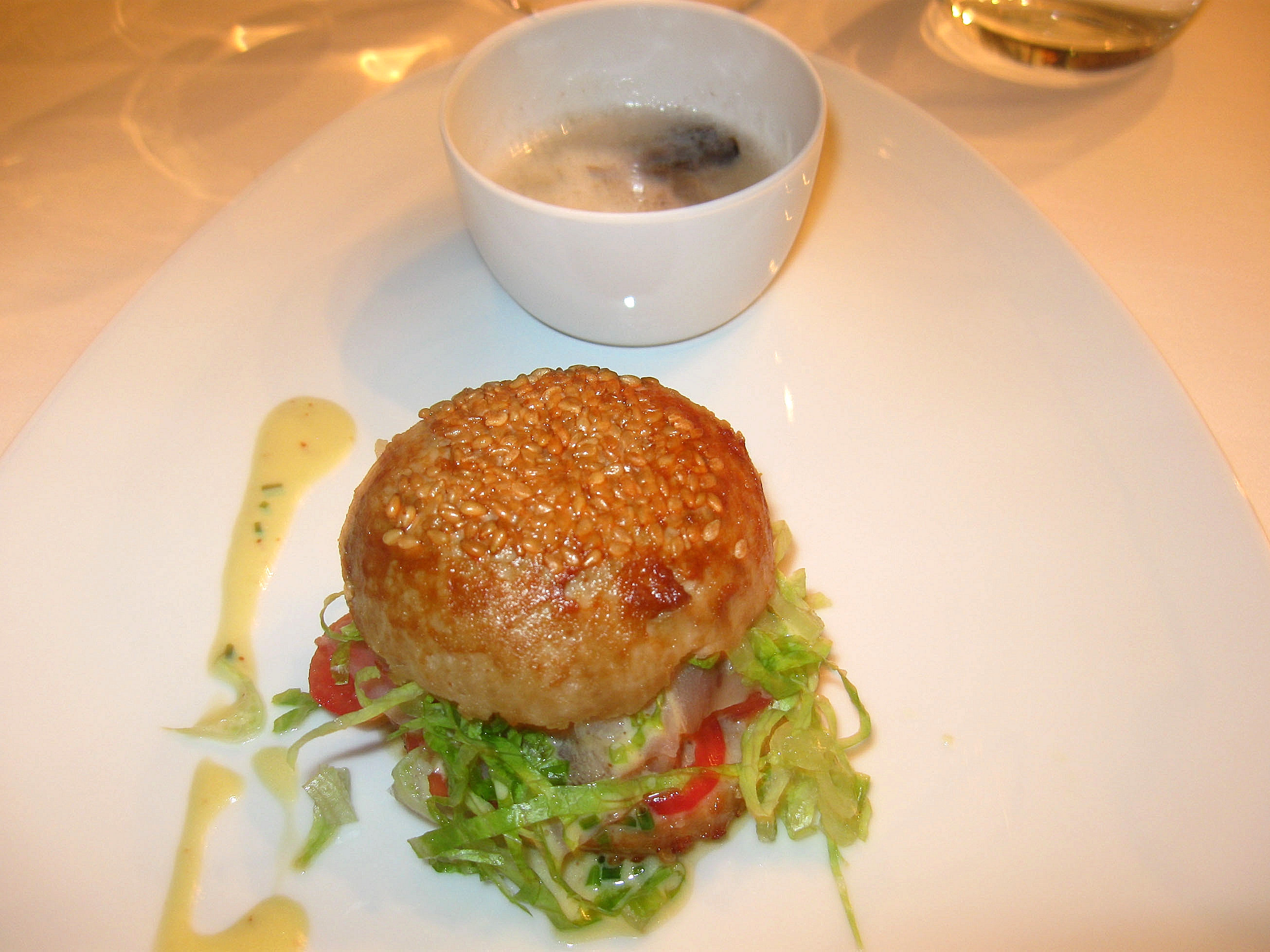 il finto fishburger viene fatto con il merluzzo e con la pancia di tonno e viene farcito con sgombro, insalata e pomodoro. A fianco, un’ostrica immersa in acqua tonica e bergamotto