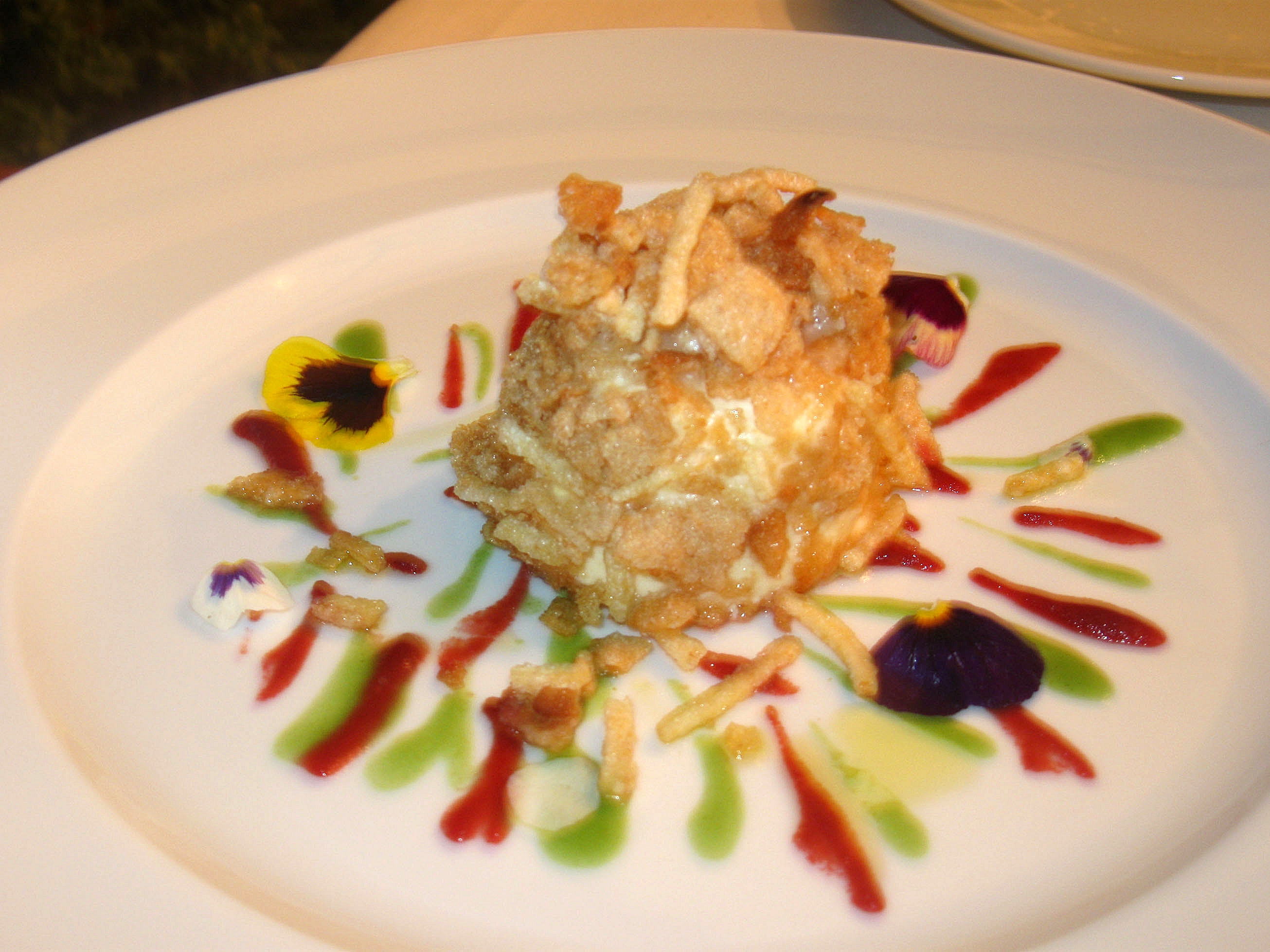la cui consistenza del finto pacchero ricavato dalla lavorazione della seppia è molto morbida e la sapidità del cous cous viene bilanciata dalla neutralità del tenerume, la verdura principale della bella stagione siciliana, (comprendente il fiore e le foglie della zucchina), il secondo primo è l’Arancino 2010,