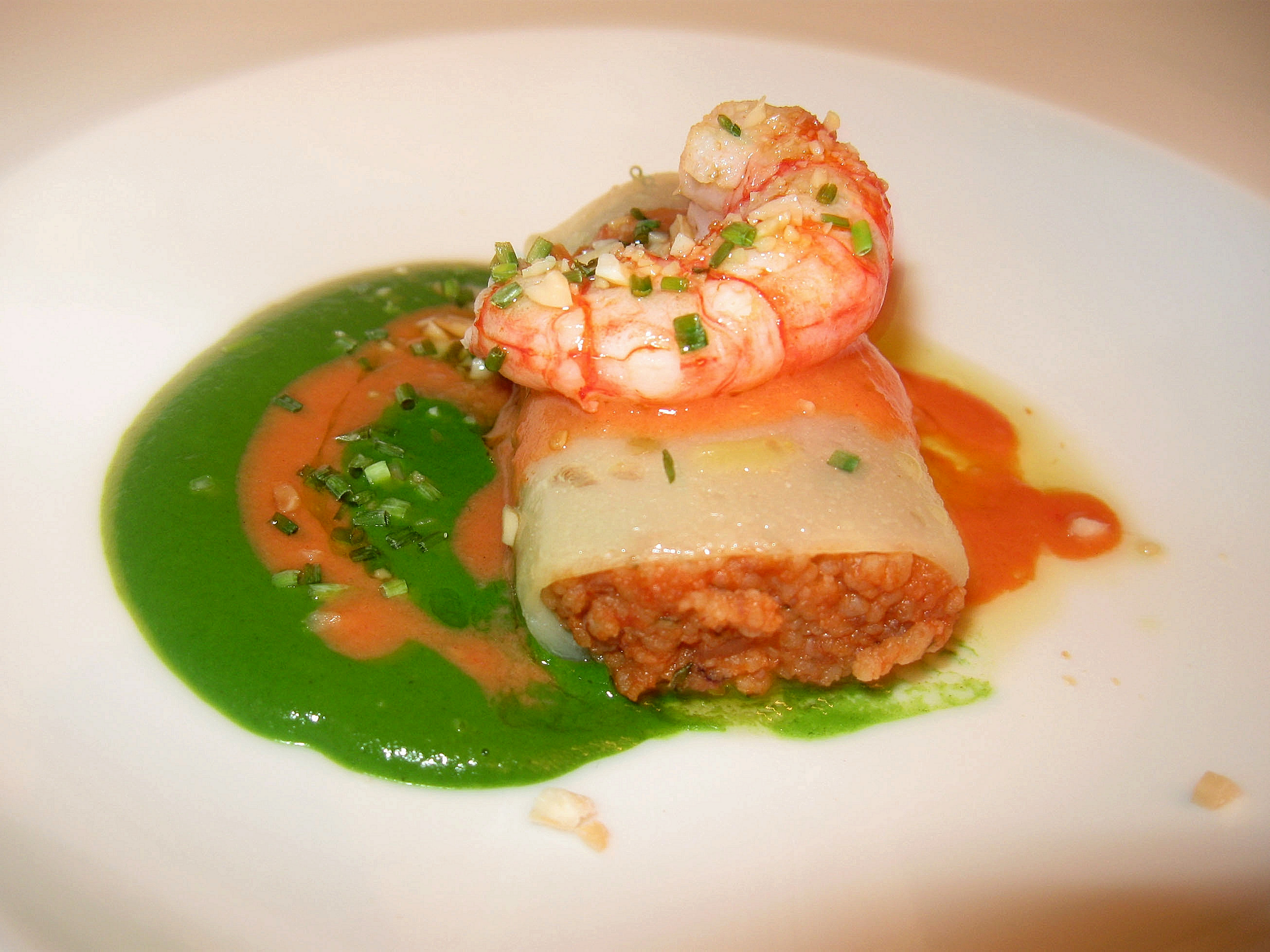 Anche per i primi piatti del degustazione creativo si gioca molto con i nomi e le reinterpretazioni. Ci vengono proposti prima i Paccheri di seppia e zafferano ripieni con cous cous ai ricci di mare, gamberi, crema di tenerumi, piatto molto delicato dai tratti orientaleggianti