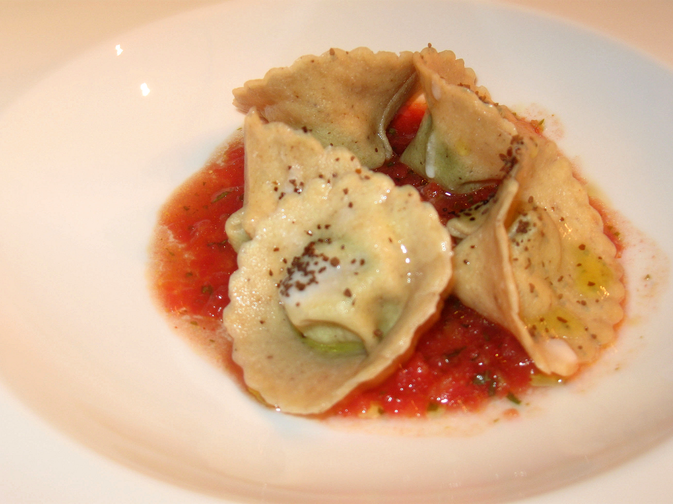 Si prosegue con un altro primo della tradizione, i Cappelli di kamut e Maiorchino ripieni di basilico con mandorla su passata di pomodoro crudo. Il piatto meno interessante della serata.