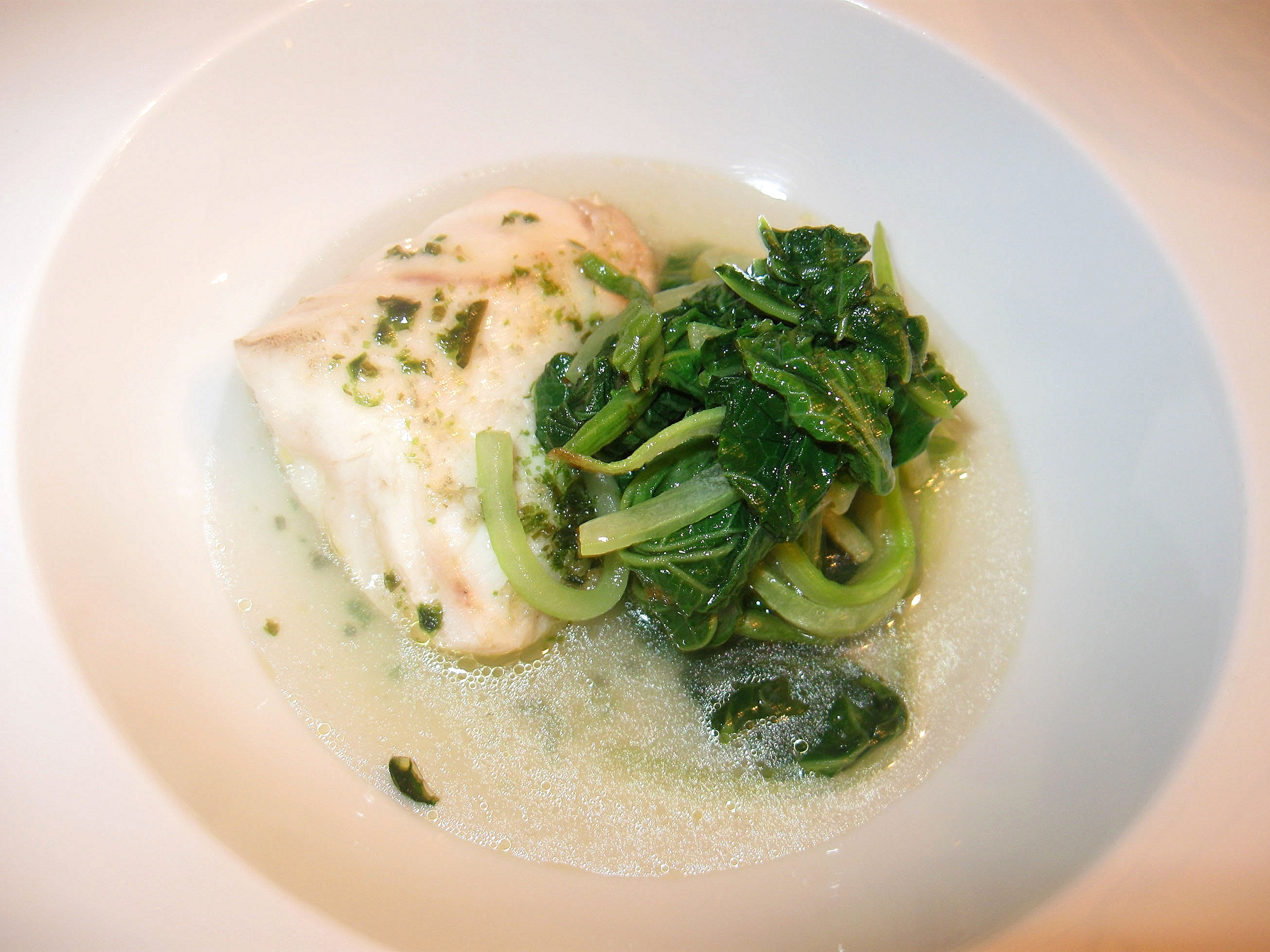 Altro grande passaggio di estrema delicatezza è la Ricciola in umido con tenerumi. Piatto semplice ma dal sapore brillante, delicatissimo. All’interno del piatto viene versato un infuso composto dal brodo del pesce e da un the nero. Qui la tradizione è difficile da reperire, ma la sensibilità della cottura del pesce è notevole.