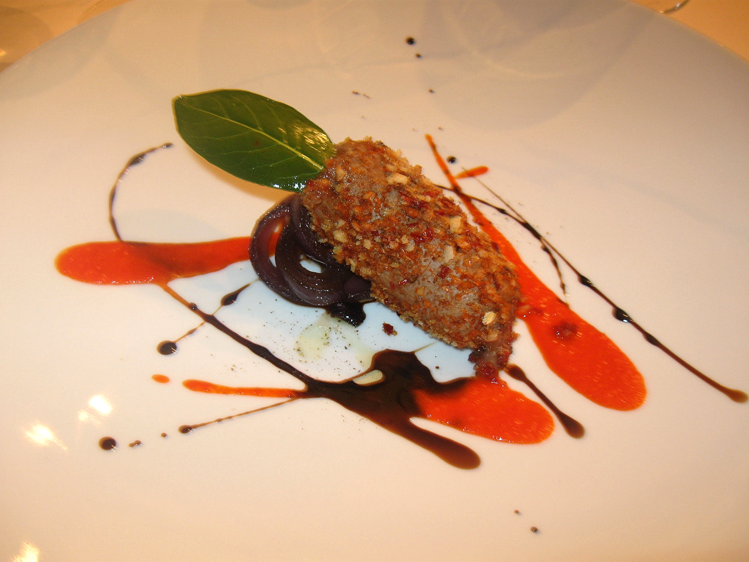 L’immancabile secondo di carne, è un involtino di vitello con cipolla stufata e crema di peperoni.