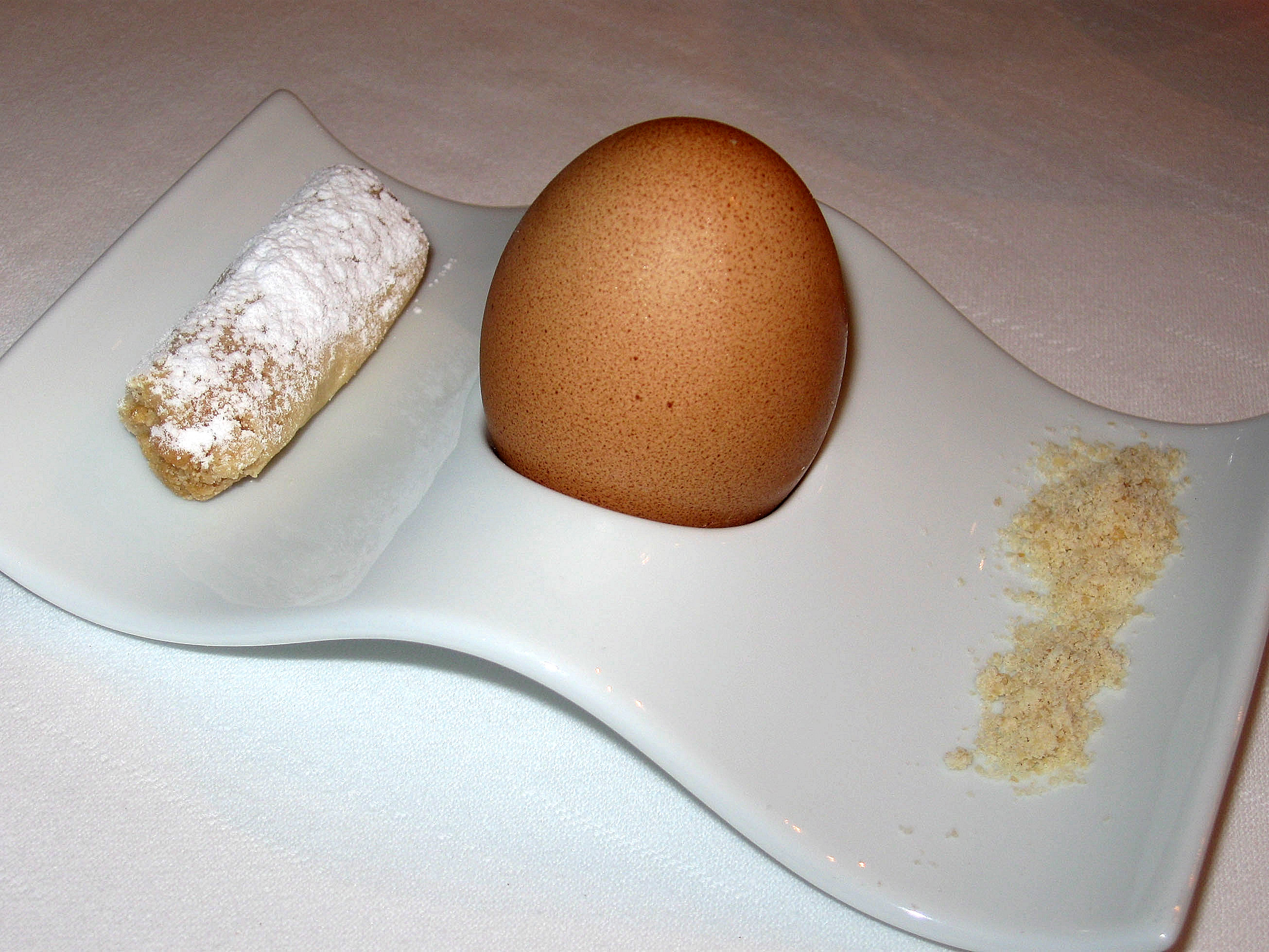 Presentazione a parte, capovolgendo il guscio dell’uovo ci si imbatte in un composto di mandorla e crema di frutto della passione dalle consistenze identiche all’albume e al tuorlo. Il tutto viene accompagnato da una polvere di mandorla ad emulare il sale e da un biscotto caldo alle mandorle da inzuppare nel composto. Grandissimo dolce.