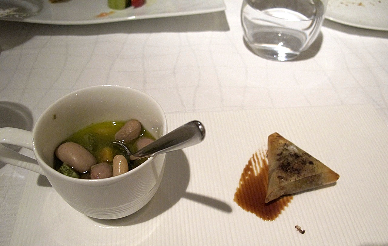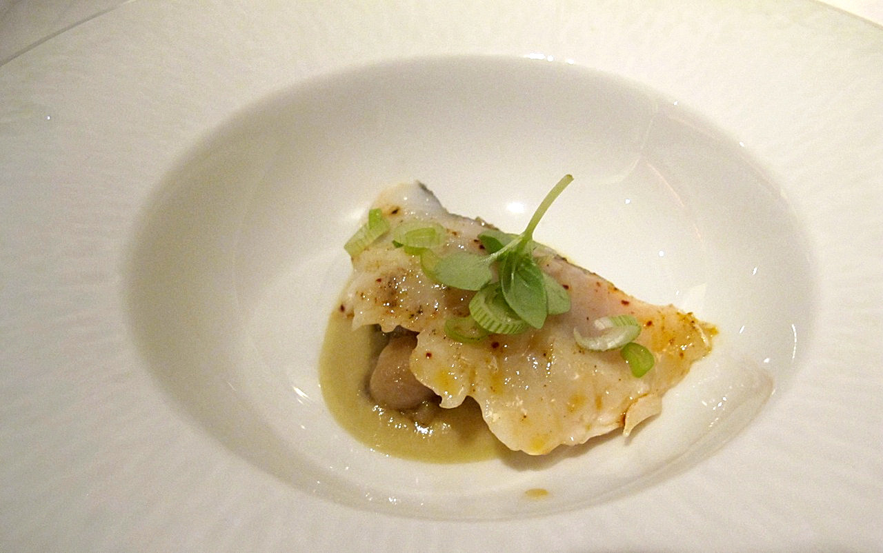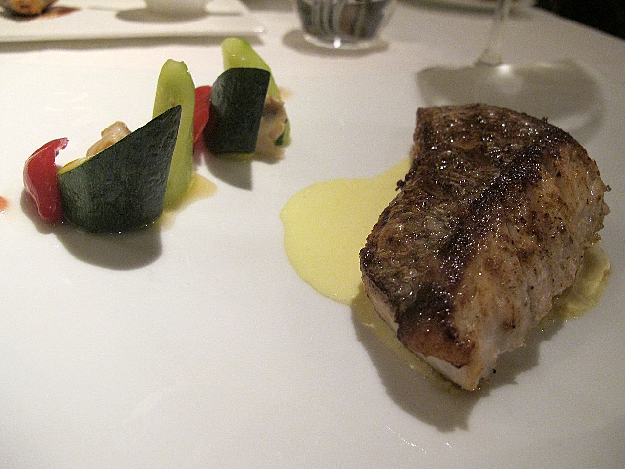 Per amuse-bouche il merluzzo a vapore, verdure grigliate, ceci e cipollotto fresco è una buona presentazione della cucina; tecnica “classica”, piatti ricchi di nunerosi ingredienti, abbinati in modo quasi sempre originale e felice