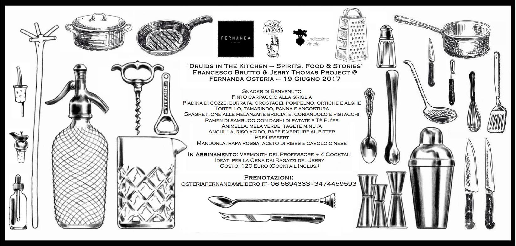 Un bell’appuntamento ‘capitolino’ a ‘6’ Mani giocato su tonalità estreme. Il 19 Giugno, presso il Ristorante Fernanda Osteria di Roma, va in scena una cena/evento dal titolo ‘Druids in the Kitchen – Spirits, Food & Stories’: il folle genio culinario di Francesco Brutto dell’Undicesimo Vineria (Treviso) incontra ai fornelli lo chef romano Davide del Duca (Fernanda Osteria) per una combo di piatti ‘alchemica’. Dieci portate cariche di contrasti ed esercizi virtuosi, che saranno supportati dagli abbinamenti ‘miscelati’ del celebre team del Jerry Thomas Project, uno dei primi autentici SpeakEasy del parterre romano. Una serata che si prospetta molto interessante e inedita sulla piazza della Capitale.