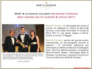 Vienna, 11 Maggio 2017. Un mare di Champagne e un trofeo d’oro firmato Moët & Chandon per celebrare Raimonds Tomsons, nuovo Best Sommelier of Europe & Africa 2017. Al termine di una nuova importante competizione, tra oltre 37 sommelier internazionali, l’ambito trofeo della Maison di Champagne ‘Moët & Chandon’ è stato assegnato al giovane vincitore originario della Lettonia (Latvia), da Shinya Tasaki (Japan – Best Sommelier of the World ’95) & Marie Christine Osselin (Oenologue Moët & Chandon)