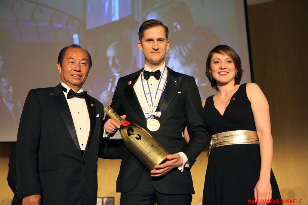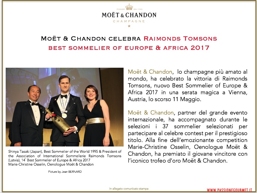 Vienna, 11 Maggio 2017. Un mare di Champagne e un trofeo d’oro firmato Moët & Chandon per celebrare Raimonds Tomsons, nuovo Best Sommelier of Europe & Africa 2017. Al termine di una nuova importante competizione, tra oltre 37 sommelier internazionali, l’ambito trofeo della Maison di Champagne ‘Moët & Chandon’ è stato assegnato al giovane vincitore originario della Lettonia (Latvia), da Shinya Tasaki (Japan – Best Sommelier of the World ’95) & Marie Christine Osselin (Oenologue Moët & Chandon)