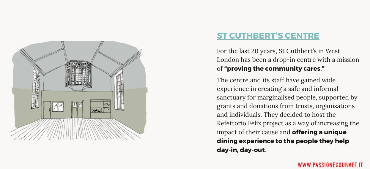 Massimo Bottura e Food for Soul, insieme a The Felix Project e London Food Month, presentano il nuovo Refettorio Felix a St Cuthbert’s. Il prossimo Lunedì 5 Giugno alle 17:00 si terrà la conferenza stampa ufficiale per celebrare l’apertura di Refettorio Felix a St Cuthbert’s: la nuova mensa comunitaria di West London a sostegno dell’inclusione sociale e alla lotta contro lo spreco alimentare.